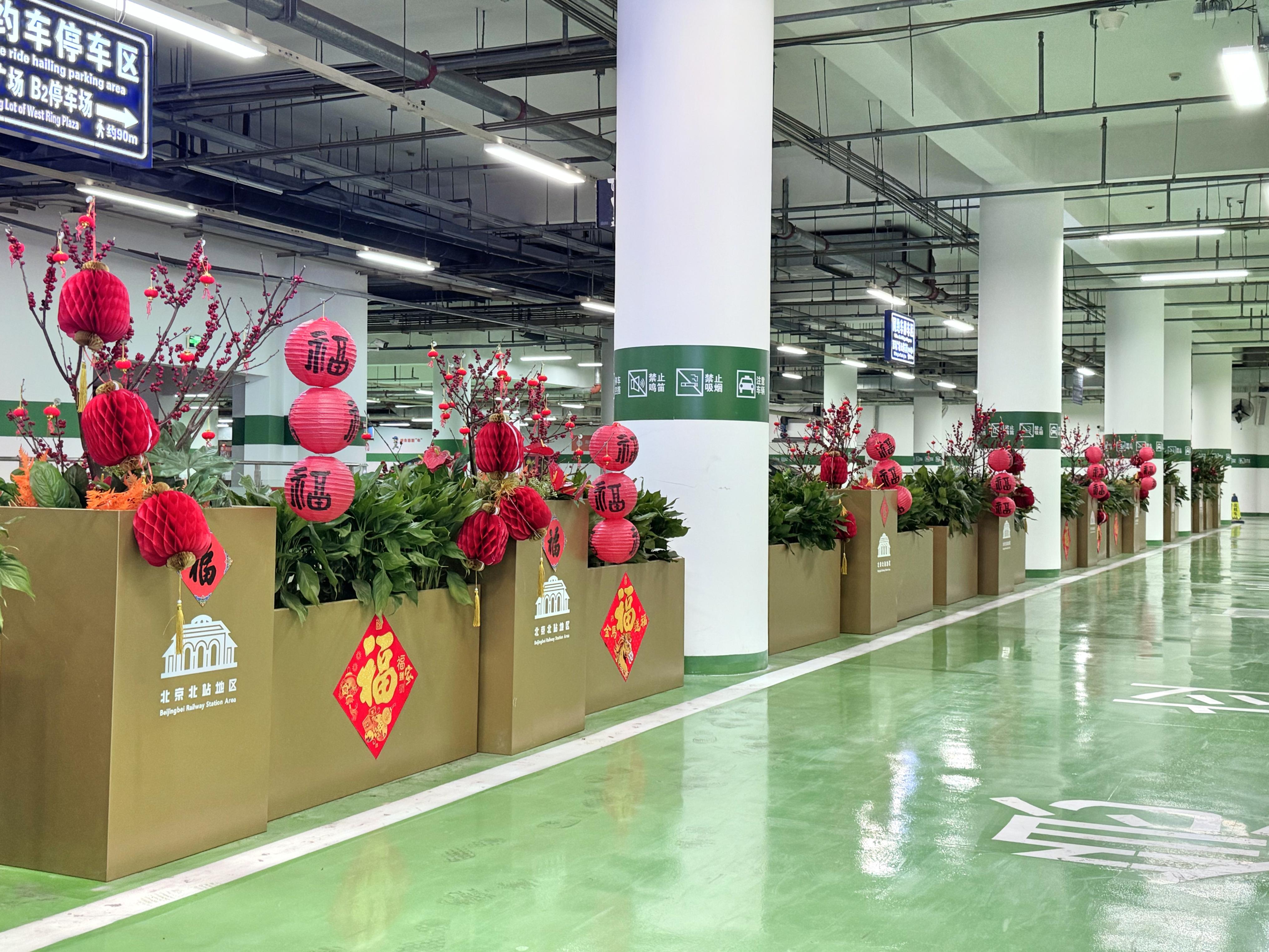 为了营造浓浓的年味儿,北京北站地区处置办公室在搭客等候区增添新年装束,更新多彩植物,为花箱挂上红灯笼、贴上大红福字。