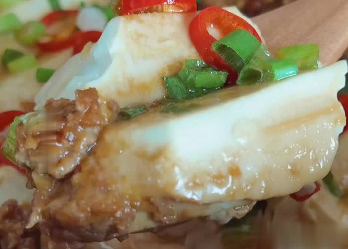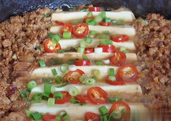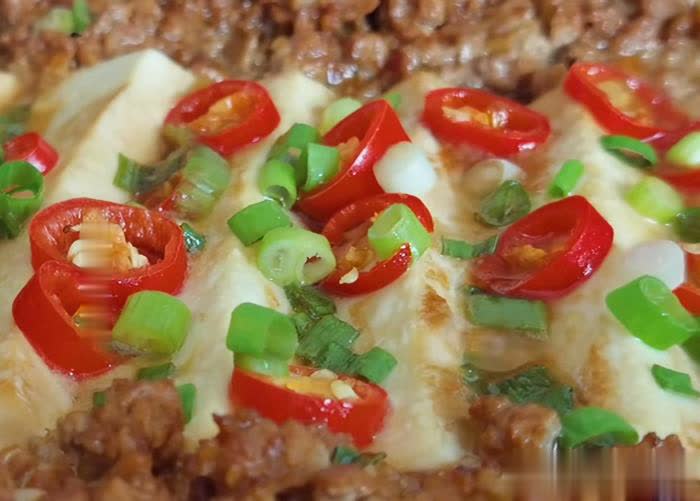 第四步:终末把熬制好的肉末铺在蒸好的豆腐双方,在豆腐表层淋一勺生抽和一勺香油,盖上盖,小火焖煮五分钟后,开盖撒上一些小米辣和葱花就不错上桌试吃。